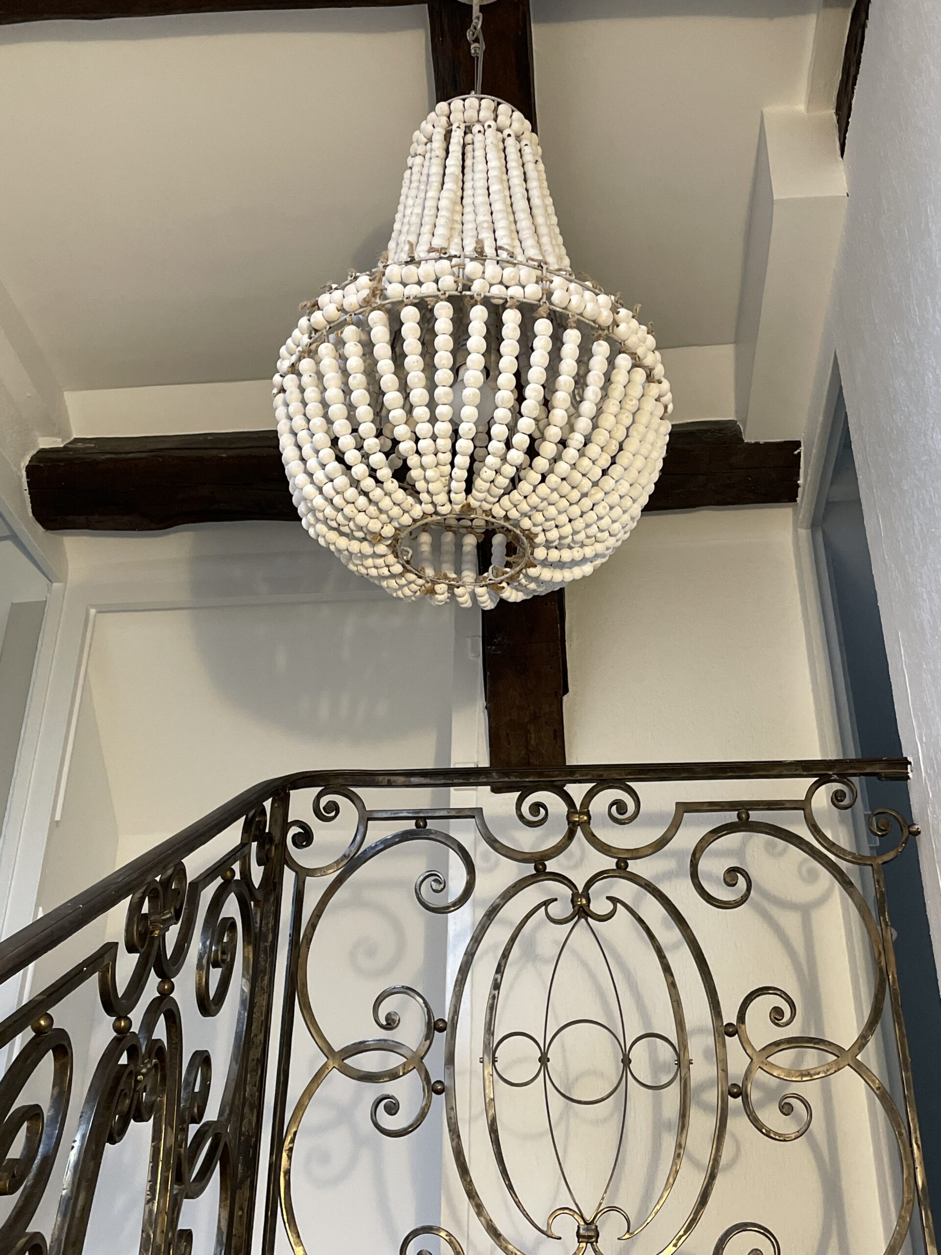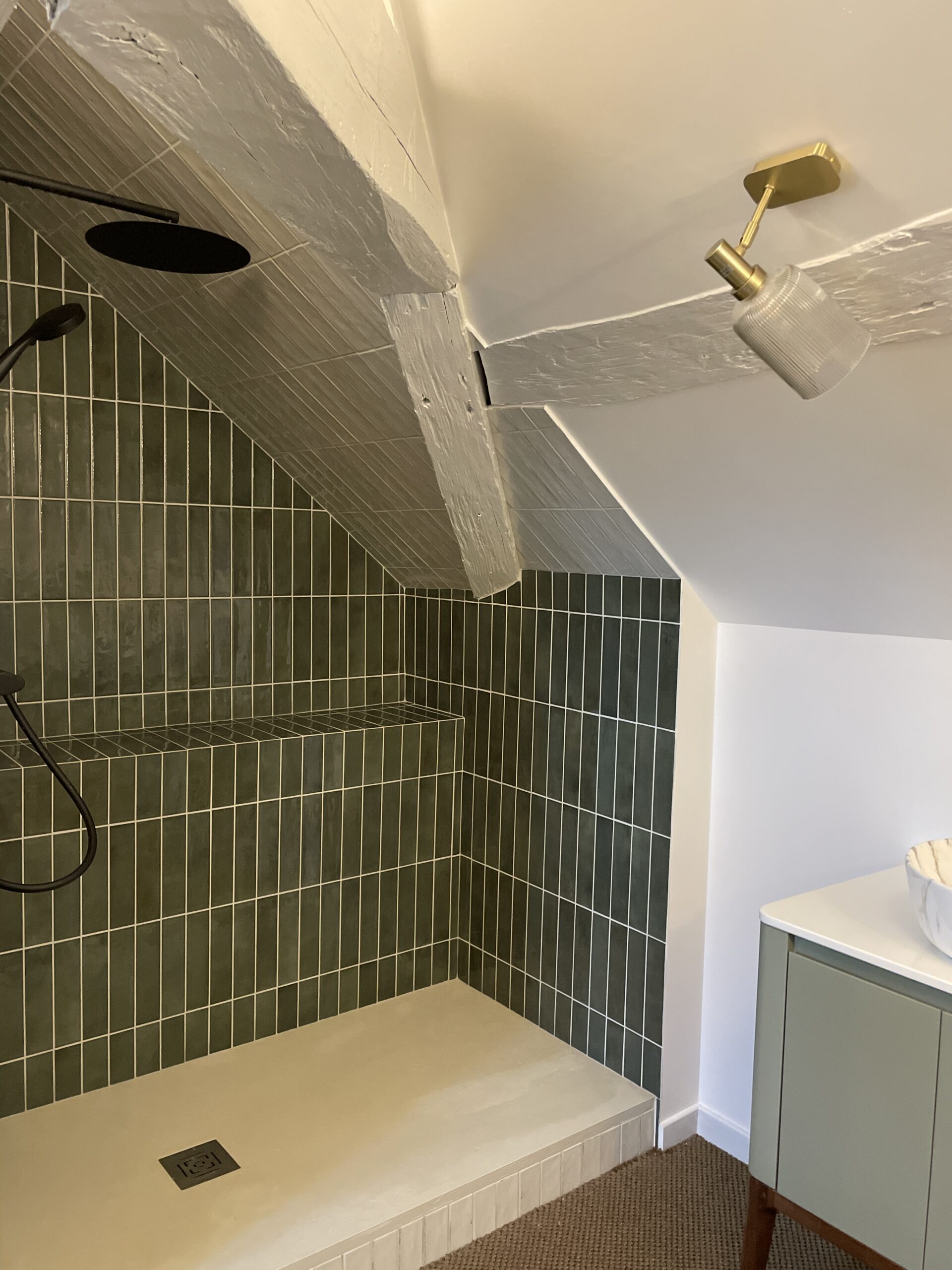Sous les combles, de nouvelles chambres voient le jour, accompagnées d’une salle de bains dédiée aux enfants. Les poutres apparentes sont nettoyées et mises en peinture, révélant toute la noblesse de la charpente.